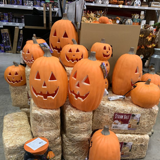 Or these oh-so-cute-and-cheeky wooden plaques nestled onto a shelf with little scarecrows and...of course...plastic pumpkins.